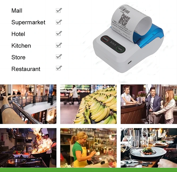 Термални Блуетоотх бежични штампачи без мастила постају све популарнији и нашироко се користе у више индустрија као што су малопродаја, угоститељство, логистика и здравство. Малопродајна индустрија га може користити за брзо штампање рачуна за куповину. У угоститељству, може одмах да штампа наруџбине. У логистичкој индустрији може да штампа налепнице за експресну испоруку. У медицинској индустрији, може да штампа медицинске картоне и рецепте. Сви ови сценарији примене показују високу ефикасност и практичност термалних Блуетоотх штампача.
