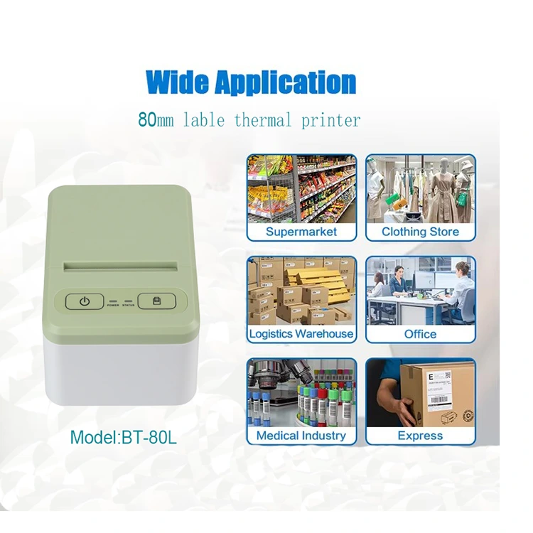 Концепт дизајна нашег термо штампача у боји је да омогући купцима да га користе у фабричким складишним системима, малим малопродајним објектима које треба да штампају мале етикете, да штампају мале етикете, бар кодове, ознаке за отпрему, налепнице итд. Модел 80Л може да подржи штампање у ширинама од 20 до 80 мм, што га чини погодним за различите купце са различитим потребама. Дизајниран је тако да буде компактне величине, што га чини погодним за ношење и постављање.
